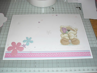 Take a sheet of the Fizzy Moon paper with a bear holding a rose. Trim to fit the card leaving a white border. Ink the edges and stick to the card blank.